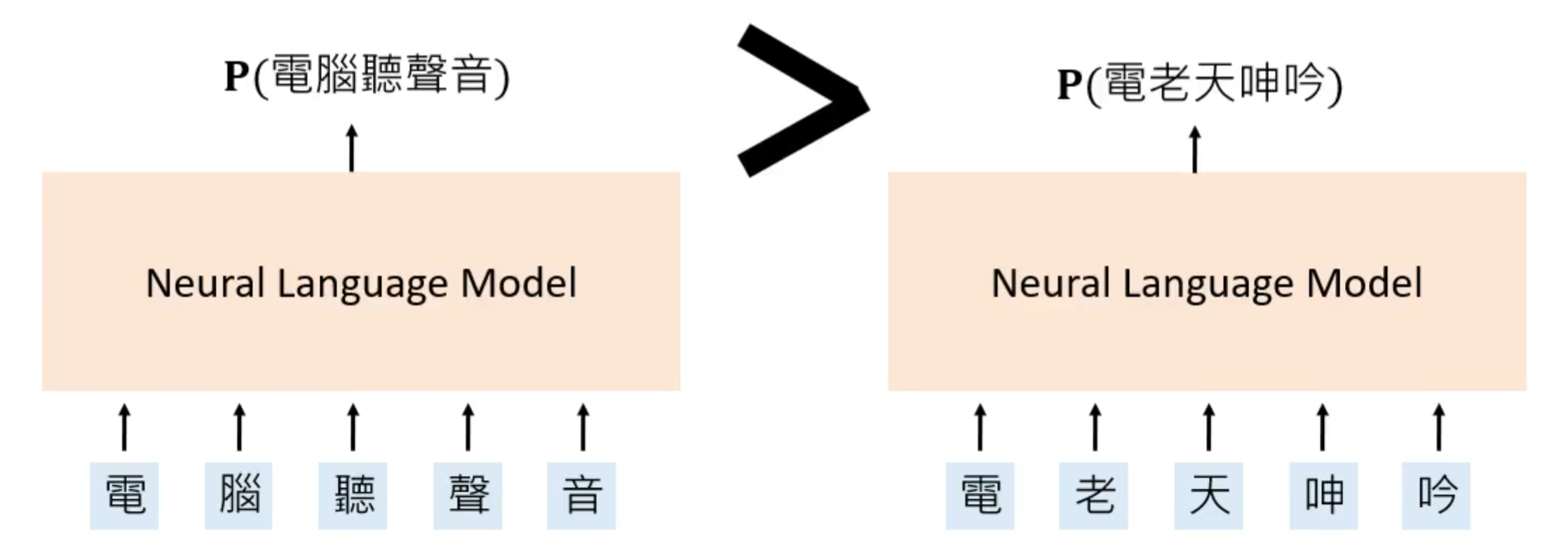 所谓自然语言模型就是一个神经网络,这个网络就是确定一个句子出现的概率大小,如“电脑听声音”和“电老天呻吟”,前者明显出现的概率要大一些。同理将这个两个句子分别输入到自然语言模型中得到的概率前者也自然要比后者大的多。