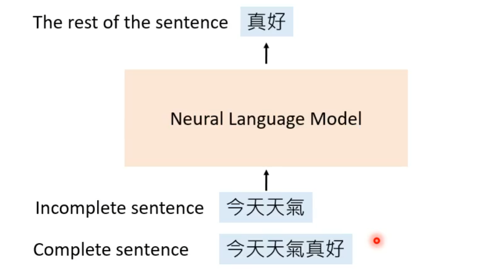 这样的模型的训练就是通过不完整的句子,让其去预测剩下的句子,就如下将“今天天气真好”中后两个字去掉,然后将这个不完整的句子输入到自然语言模型中,让其预测句子后面需要加上的字。