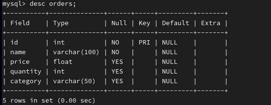 create table orders (id int primary key,name varchar(100) not null,price float,quantity int,category varchar(50));