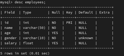 create table employees (id int primary key, name varchar(50) not null, age int, gender varchar(10) not null default 'unknown', salary float);