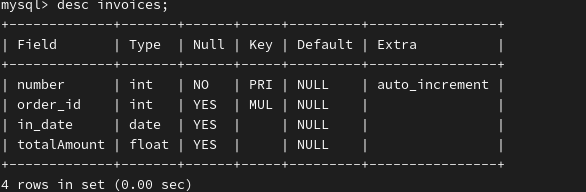 create table invoices (number int primary key auto_increment, order_id int, in_date date, totalamount float check (totalamount > 0), foreign key (order_id) references orders(id));