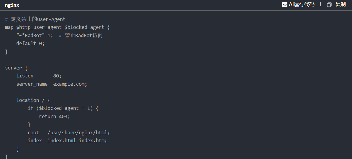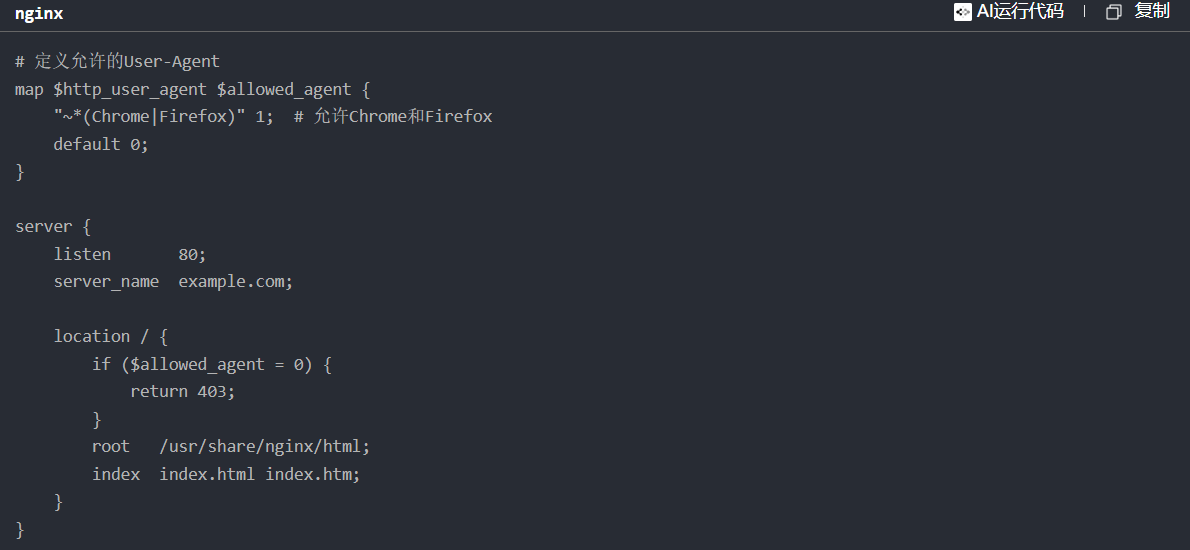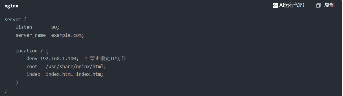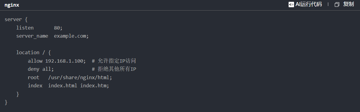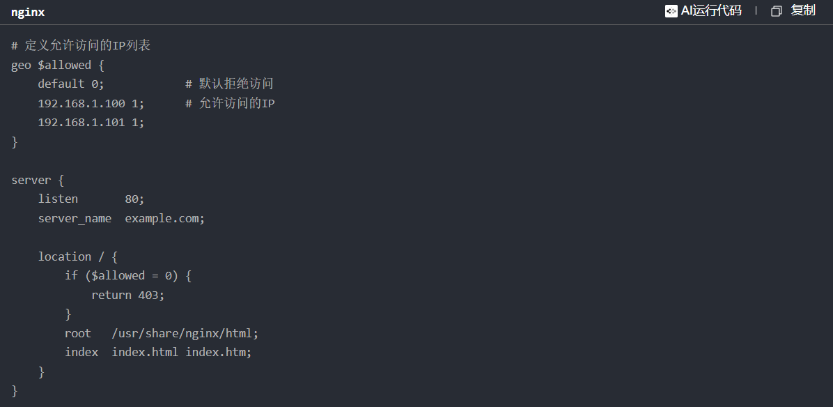 方法一:使用 allow/deny 指令(Nginx 0.7.64+)