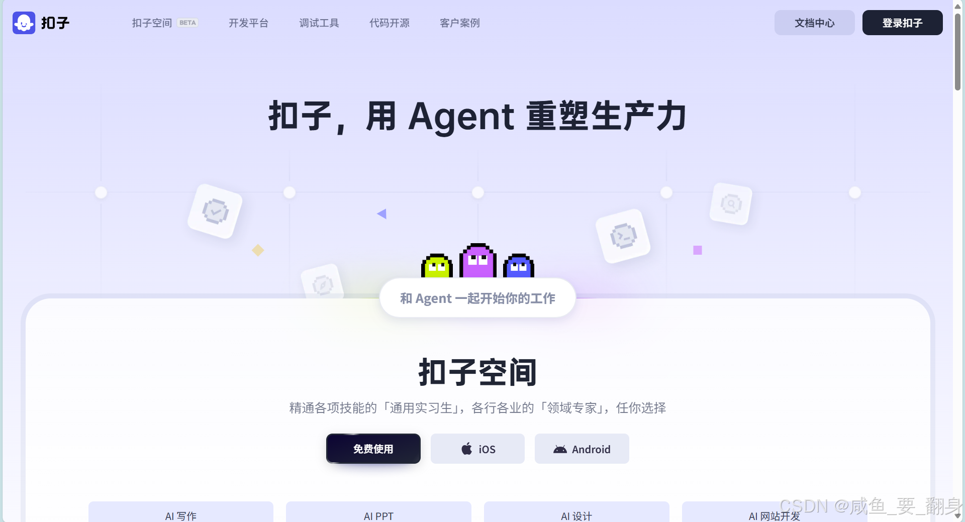 Coze,也被亲切地称为扣子,是字节跳动精心打造的新一代 AI Agent 开发平台。无论你是毫无编程基础的初学者,还是经验丰富的开发者,都能在扣子平台上大显身手。在这里,你可以快速搭建基于大模型的各类 AI 应用,满足多样化的需求。搭建完成后,这些 AI 应用不仅可以直接发布到各个社交平台、通讯软件,与广大用户进行互动,还能通过 API(Application Programming Interface,应用程序编程接口)或 SDK(Software Development Kit,软件开发工具包),无缝集成到你的业务系统中,为业务发展注入强大动力。