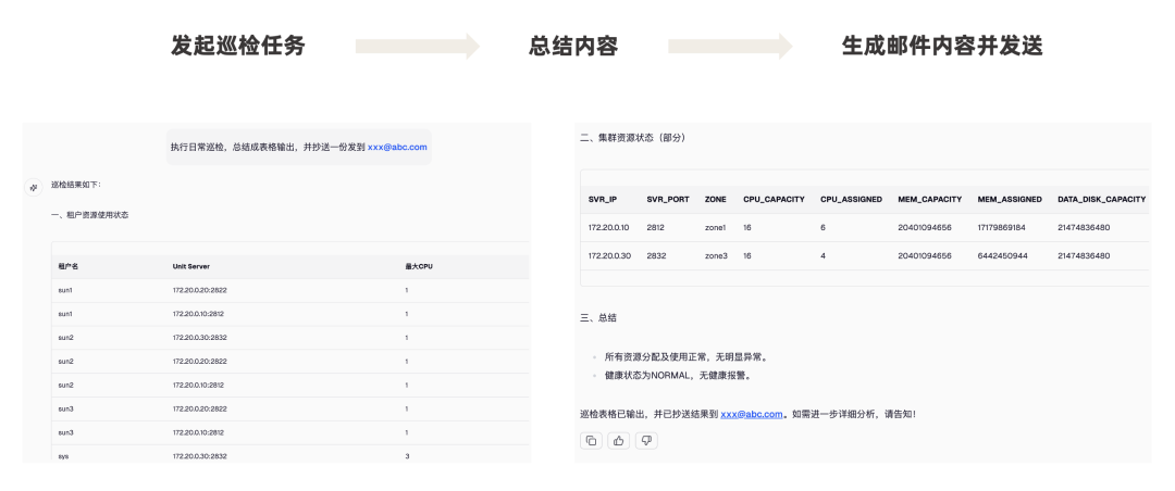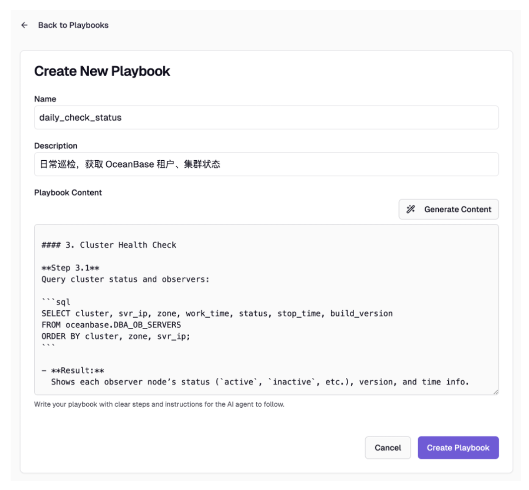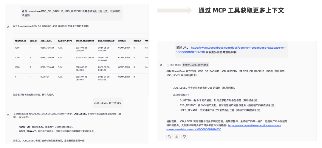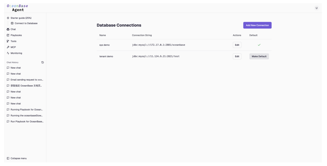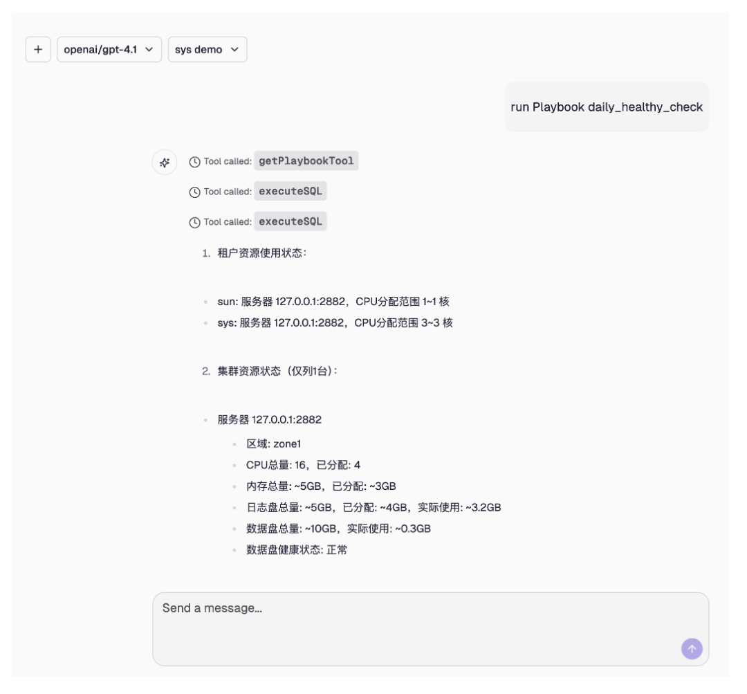 用户仅需用自然语言描述任务,系统会自动化执行。例如“查询 OceanBase 的慢查询,并分析原因”。可明确每个工具的名称,以提高成功率。 -