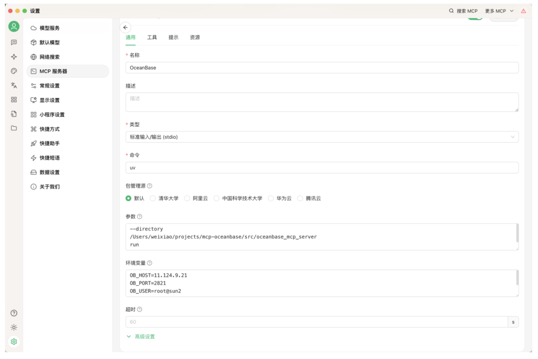 每新增一个数据库就必须启动一个独立的 MCP Server,重复填写环境变量,工具列表随之膨胀,令大模型难以区分。以 Cherry Studio 为例,需要在该工具的 MCP 配置界面手动填写数据库连接的环境变量,才能检测到 MCP Server 提供的工具,例如执行 SQL 工具 execute_sql、获取 ash_report 工具 get_ob_ash_report 等,可以调用这些工具直接在数据库中执行。但如果有多个数据库时,例如需要加两个数据库,MCP Server 是不支持的,只能通过加两个 MCP Server 实现,需要填两个数据库地址,此时工具也会有两份,对于大模型面对两份一模一样的工具列表可能就很困惑。 - 连接信息不透明