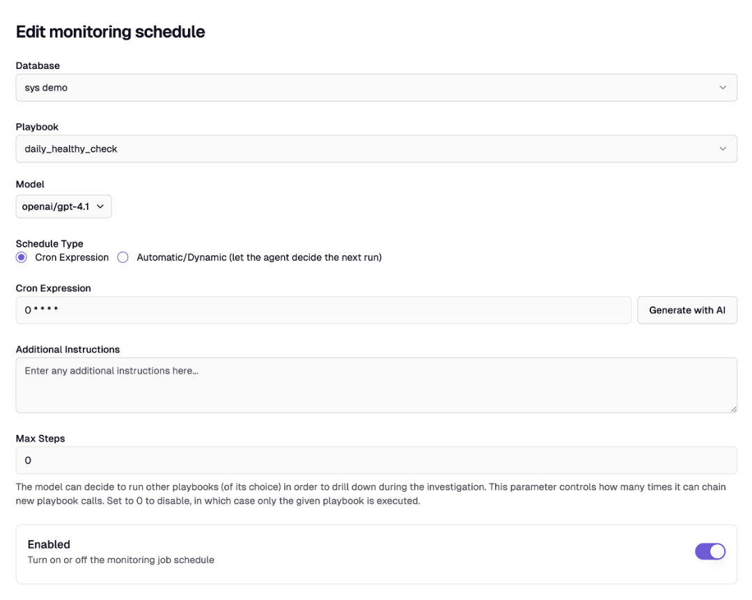 日常巡检可以配合 Scheduler 运行,并使用 AI 生成 Cron Expression 表达式,生成 Scheduler 后即可实现定期执行 Playbooks。