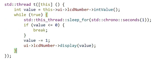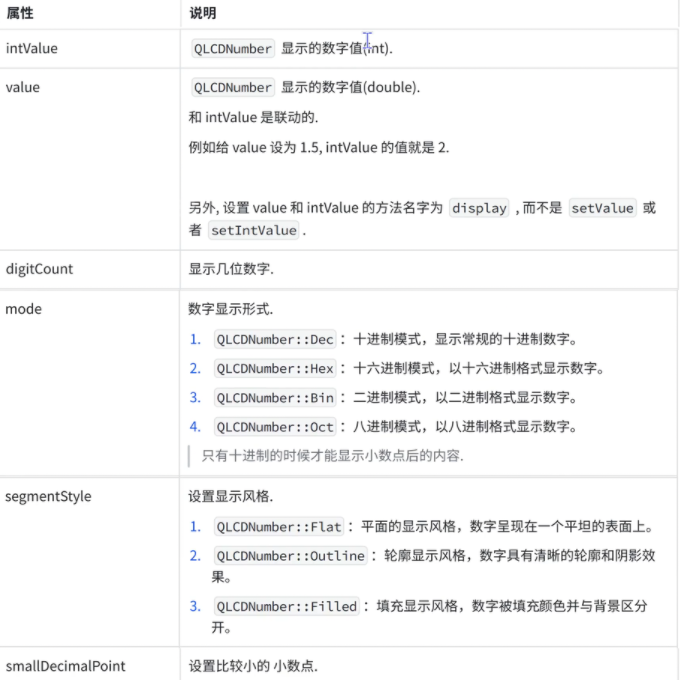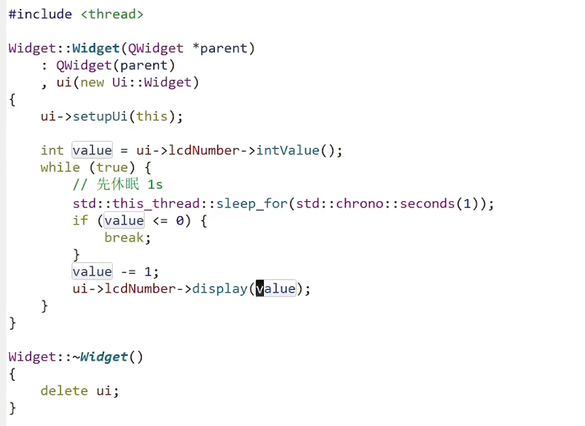 {//先拿到 LCDNumber 中的数字int value =ui->lcdNumber->intValue();if(value<=0){// 数字减到 0 了,停止定时器.timer->stop();return;}ui->lcdNumber->display(value -1);