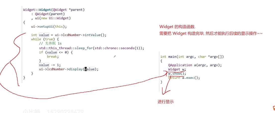 {ui->setupUi(this);//设置初始值ui->lcdNumber->display(10);// 创建一个 QTimer 实例timer = new QTimer(this);// 把 QTimer 的 timeout 信号和咱们自己的槽函数进行连接connect(timer,&QTimer::timeout, this,&Widget::handle);// 启动定时器,参数是触发 timeout 的周期,单位是 mstimer->start(1000);