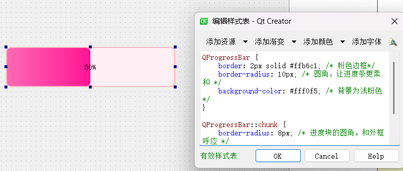 QProgressBar {border: 2px solid #ffb6c1; /* 粉色边框*/border-radius: 10px; /* 圆角,让进度条更柔和 */background-color: #fff0f5; /* 背景为浅粉色 */
