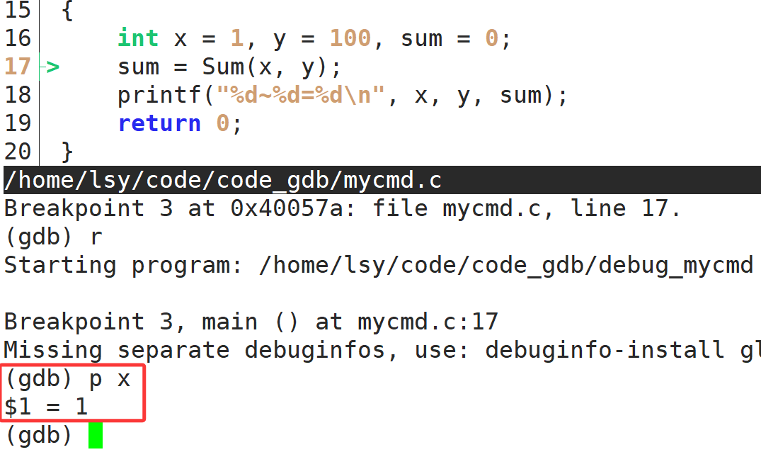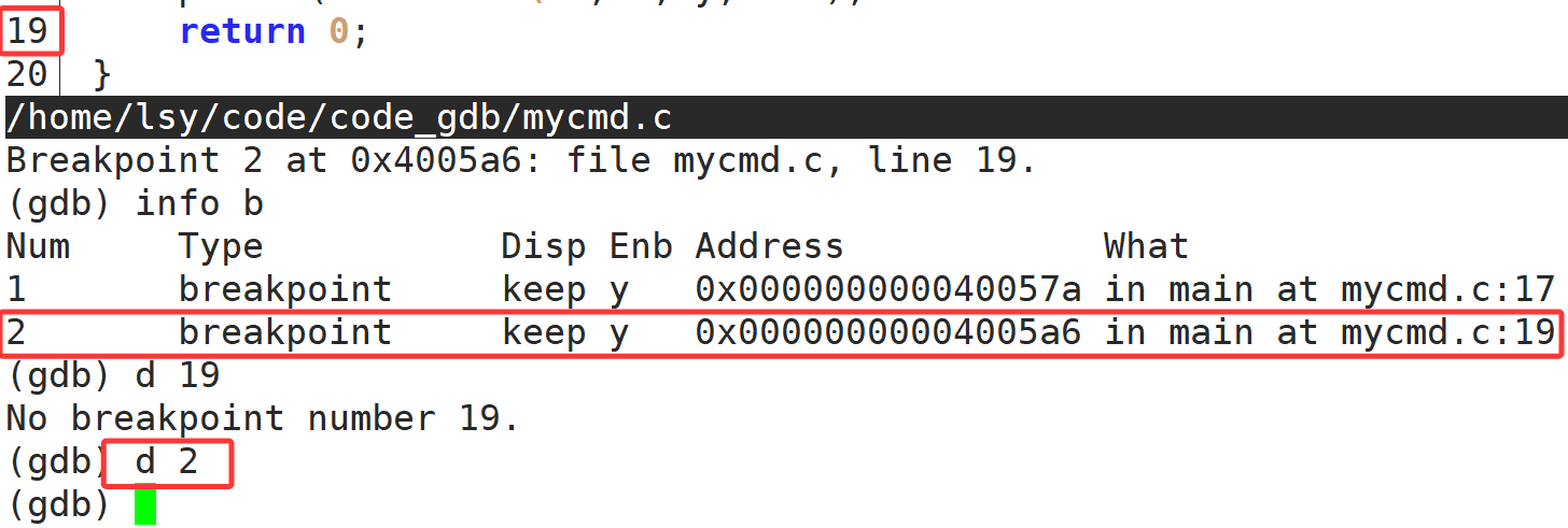 Breakpoint 1 at 0x4005ab: file mycmd.c, line 20.