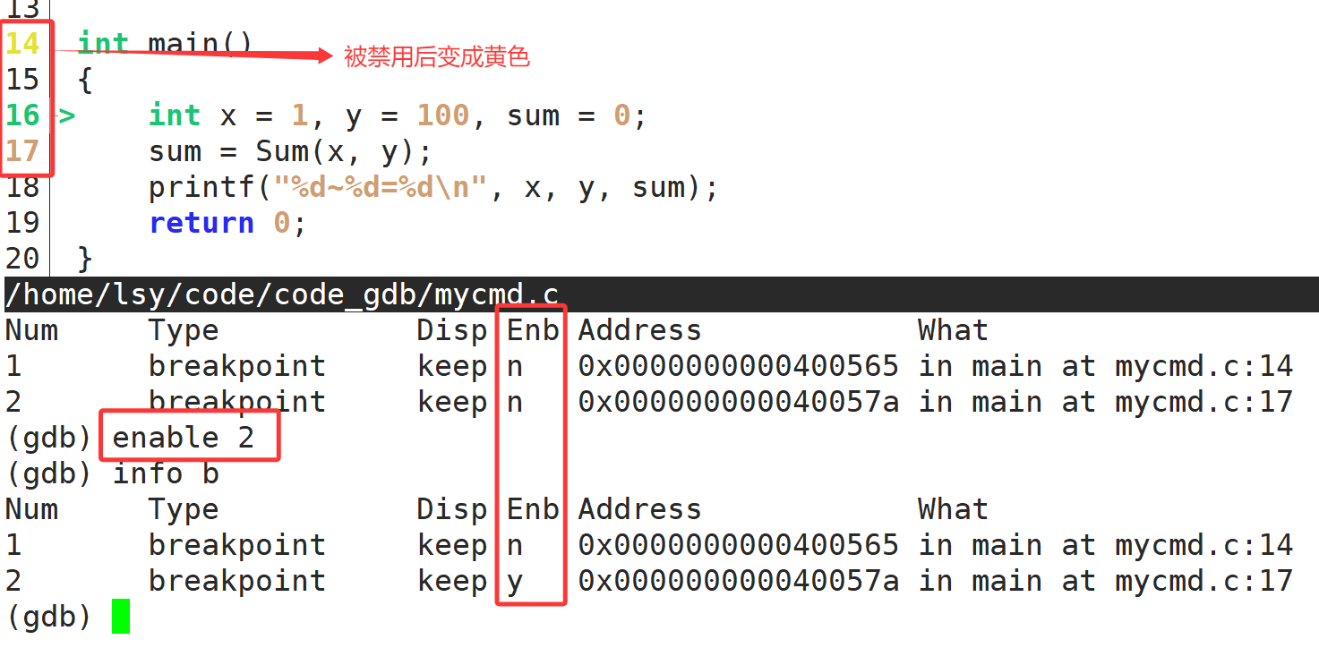 15. enable +断点号/breakpoints 启用某个/所有断点