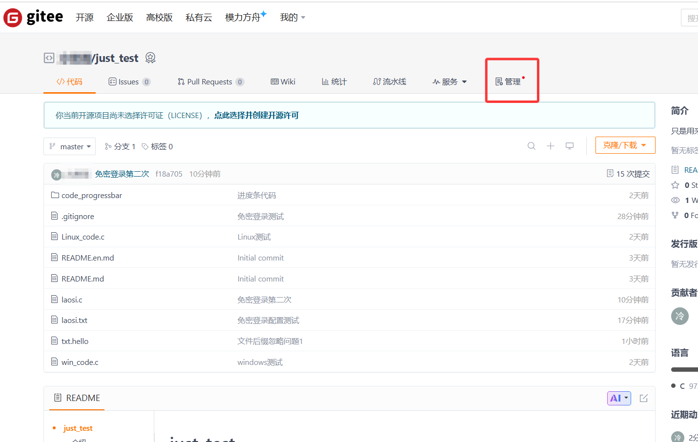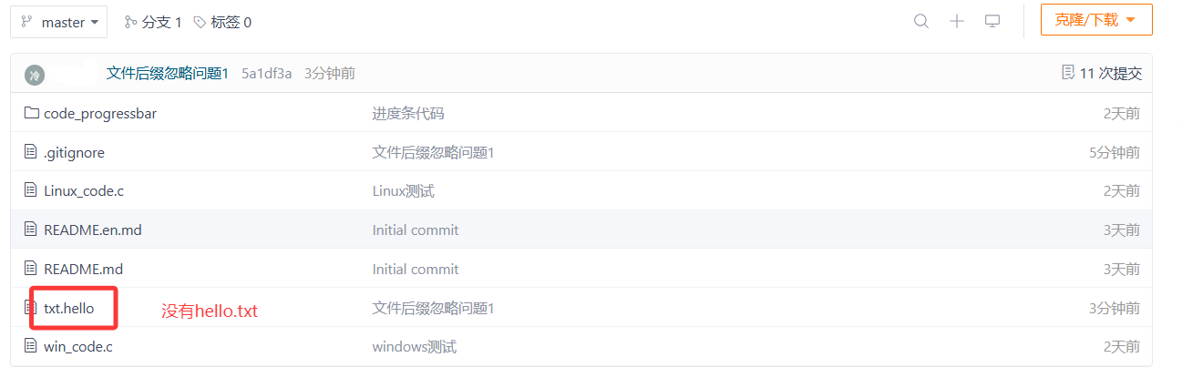 但是我们可以去gitee的远端仓库看一下,commit并没有提交到远端仓库。git status还提示我们可以使用git push推送我们的本地仓库。