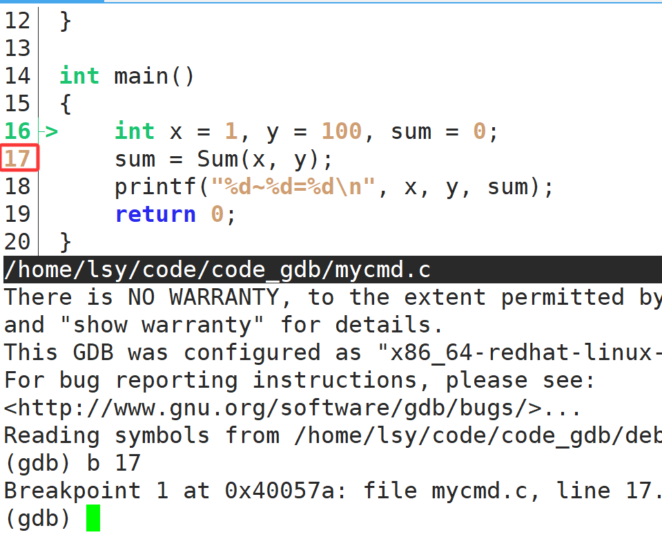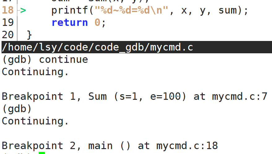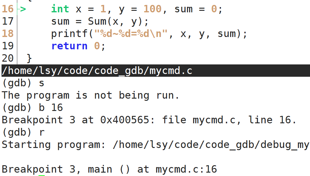 方式1:b +行号。如,b 20,这样就在第二十行打上了断点,此时再r就不会执行完,而是停在第二十行。
