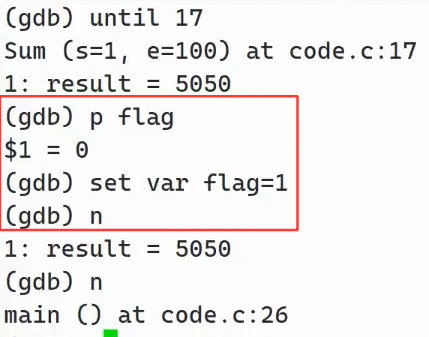 ② 比如在调试的过程中,我们发现flag的值错了,不能得出正确结果,想要修改它的值。但是不想退出gdb,再vim修改源代码,重新编译调试。此时就可以用 set var 先暂时修复数据,不影响继续调试,提高效率。