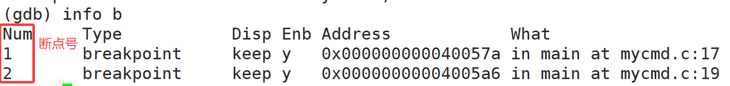 4. info b 查看我们打的断点,每个断点都有自己的断点号。