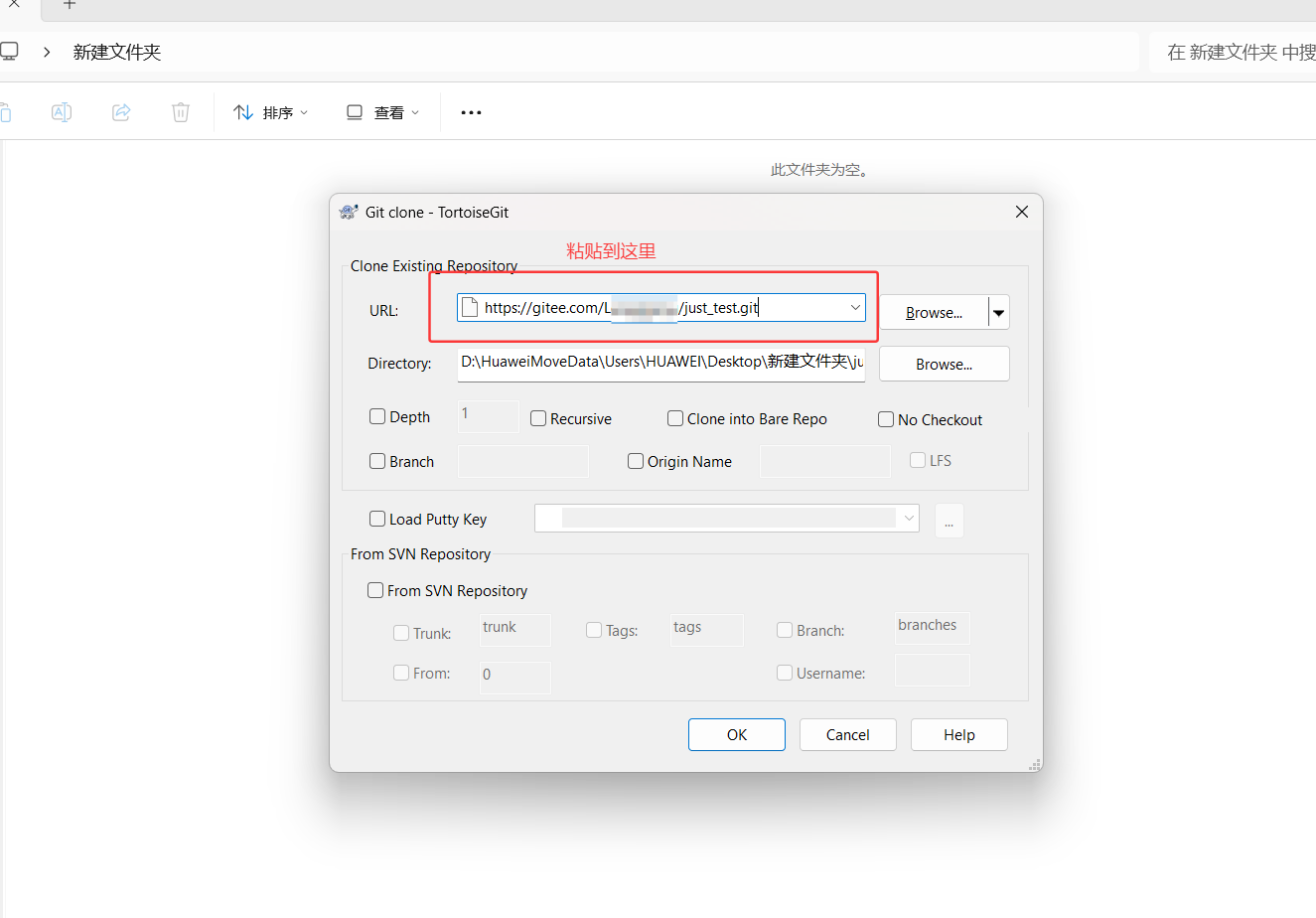 我在本地windows桌面上创建一个文件夹,并克隆刚刚我们创建的远端仓库到这个文件夹中(要安装好小乌龟工具)。
