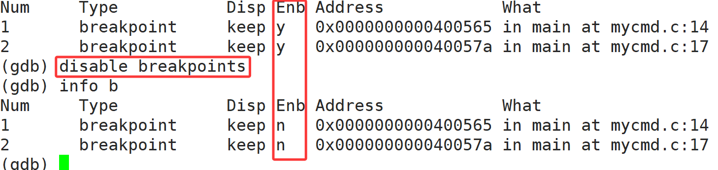 14. disable +断点号/breakpoints 禁用某个/所有断点