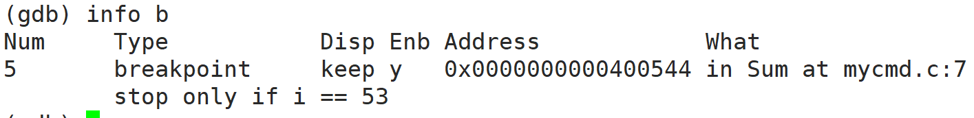 condition +断点号 +要新增的条件 如:condition 2 i == 53(注意这里不需要 if 了)
