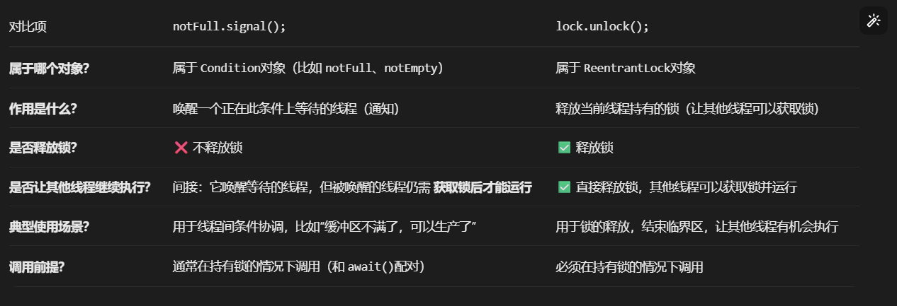 try {while (queue.size() == capacity) {notFull.await(); // 缓冲区满了,生产者等待}queue.add(item);notEmpty.signal(); // 通知消费者:缓冲区非空了,可以消费了