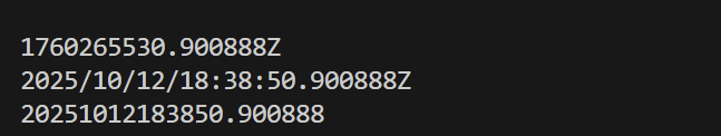 string toString()const;//"123.32z"string toFormattedString(bool showmicto=true)const;//"2025/10/11 15:29:23"//"2025/10/11 15:29:23.32z"string toFormattedFile()const;//20251011152923.32