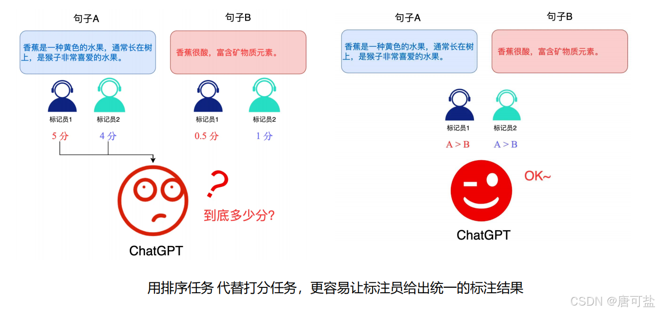大模型训练中的关键一步是构建奖励模型,但直接让标注员为回答打分(如图中5分、0.5分)主观性强,难以统一标准。为解决此问题,实践中采用排序任务替代打分:标注员只需判断同一问题的多个回答(如句子A与B)的优劣(例如“A > B”),这更容易达成一致。