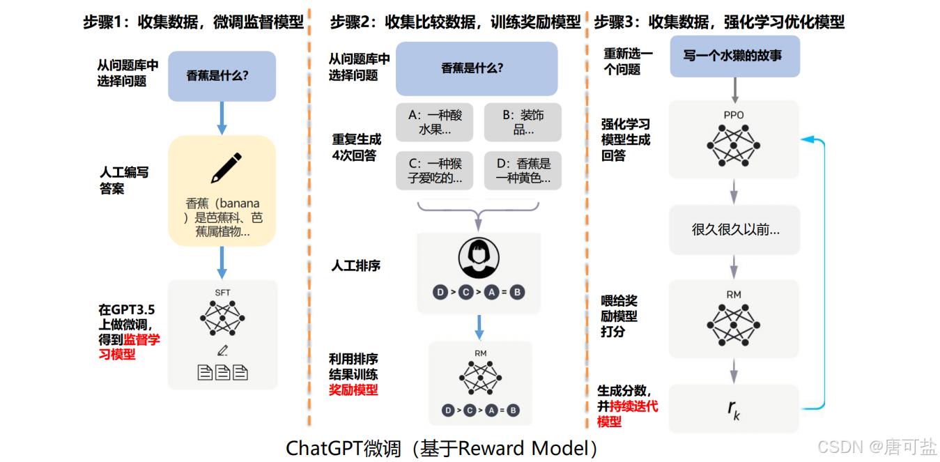 首先,进行监督微调:从问题库选取问题并由人工撰写高质量答案,再利用这些数据微调基础模型(如GPT-3.5),使其初步掌握问答能力。
