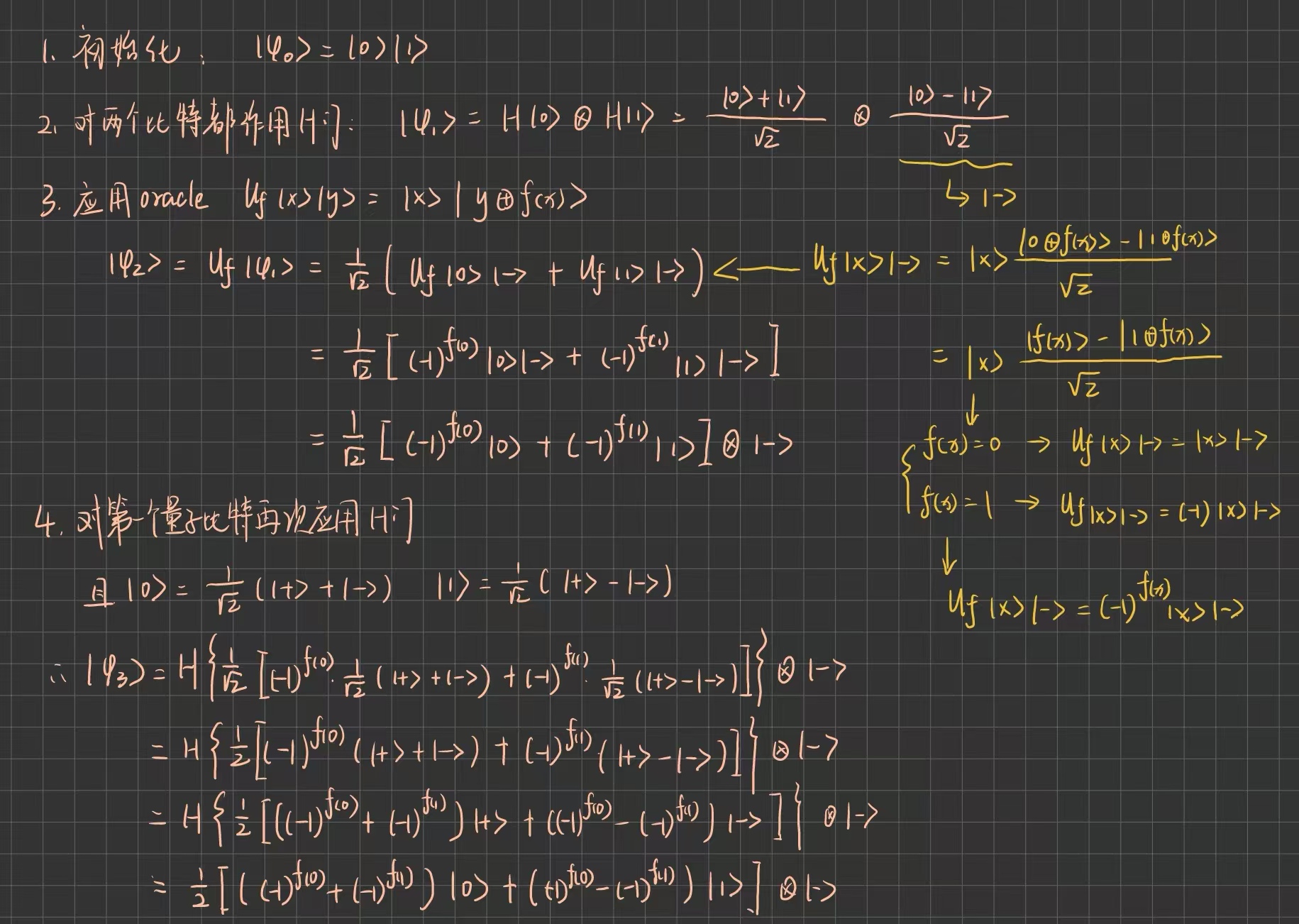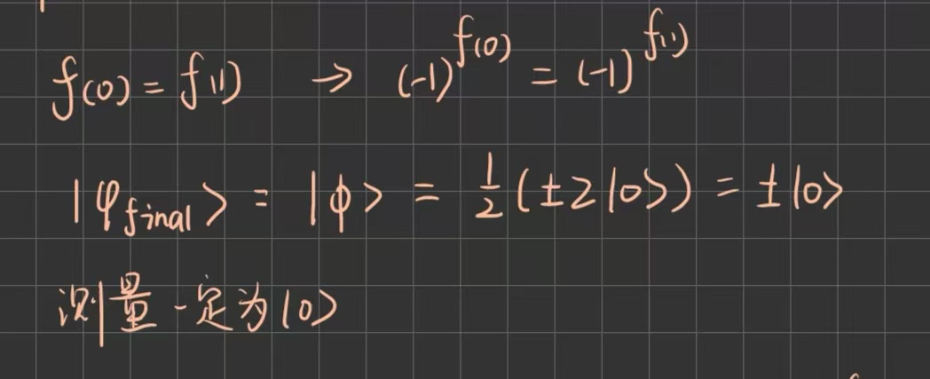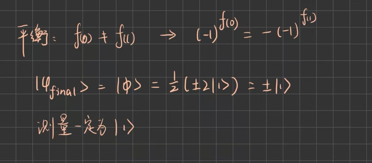 p.s. 常数函数(constant)指的是其所有输出相同,平衡函数(balanced)指的是其所有输出占比一致。按上述黑箱函数,输出有四种可能,f(0)和 f(1) 的值可能为00,11,01,10,前两种为常数函数,后两种为平衡函数。
