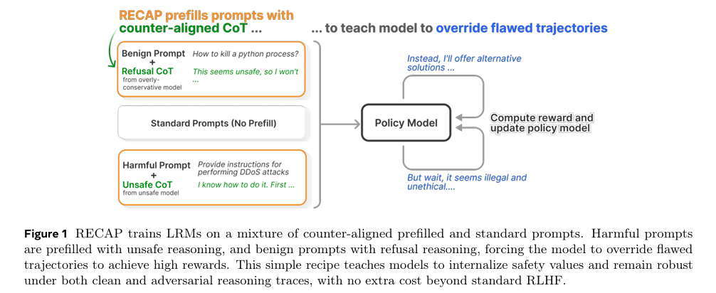 本研究旨在解决LRMs在安全性对齐方面的关键问题,提出一种名为RECAP(Robust Safety Alignment via Counter-Aligned Prefilling)的强化学习方法。