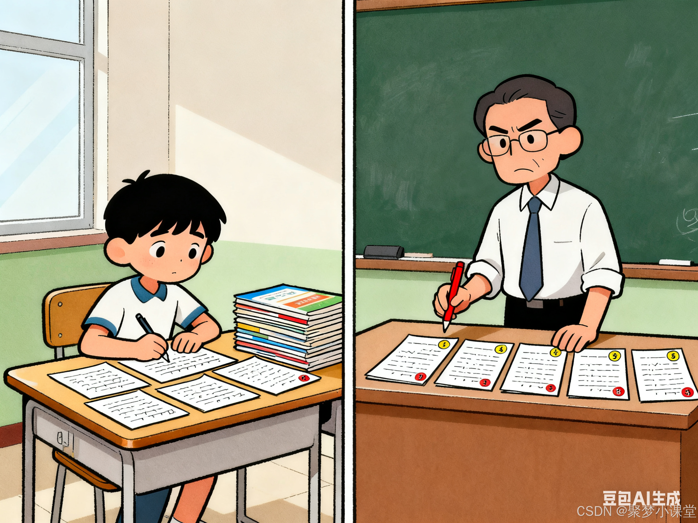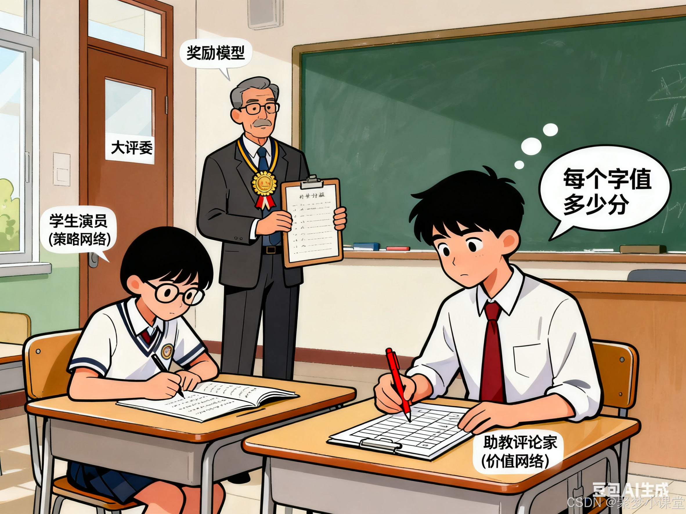- 左边坐着“学生演员”(策略网络),负责写作文。