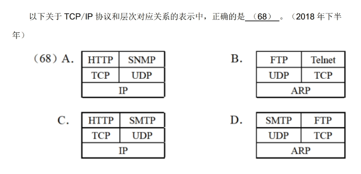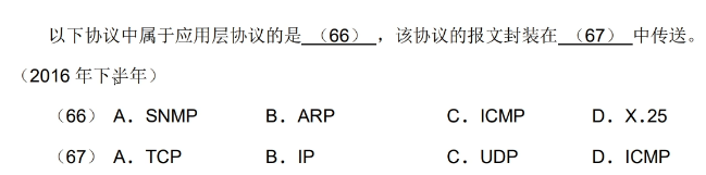 应用层的协议很多,包括HTTP,DNS等,首先可以把ARP和ICMP排除了,这都是属于网络层,应用层是没有小数的,也排除,只能是SNMP。而既然是应用层,那肯定用到的是传输层,也就是TCP或者UDP,只要不包含字母T的那么就一定不是TCP,那就只能是UDP。