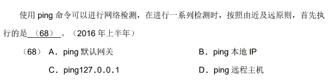 根据由近及远的原则,使用ping进行网络检测的时候,首先是ping127.0.0.1,然后是本地IP,其次是默认网关,最后是远程主机。