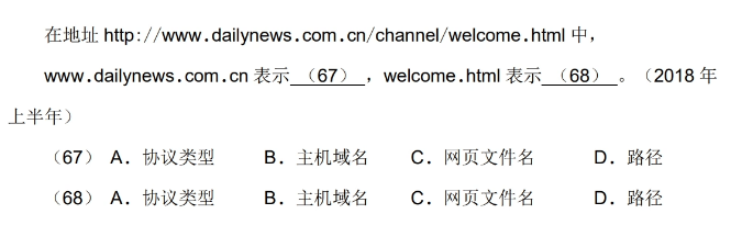 很明显,在http协议后面的www.dailynews.com.cn是表示服务器所在的地址,故这里是域名(或者主机名)因为它最后是要查找welcome.html这个文件,所以表示的一定是一个网页文件名,答案为B,C