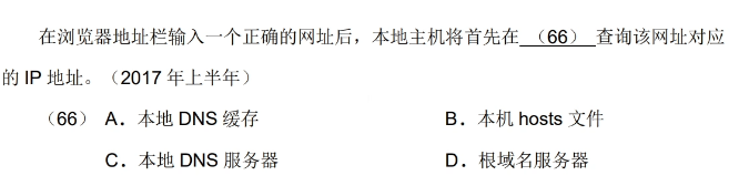 本题考察的是IP地址的查询顺序,应该是先到浏览器缓存和操作系统缓存中找,然后去本地文件查找,再到DNS中去找,最后才去域名服务器中去找,所以本题最优先的就是本地文件。