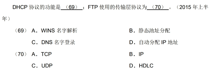 DHCP都是动态的分配地址,也就是说D项的自动分配IP地址是正确的;而FTP是需要安全、准确的传输,所以应该选用TCP。也可以直接根据之前背的,名字中带有字母T,所以是TCP。