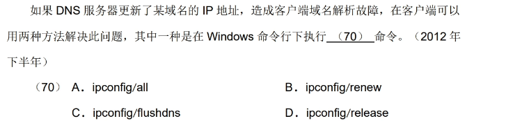 这题需要清楚的是DNS更新了,所以需要刷新的是DNS,应该执行ipconfig/flushdns命令。