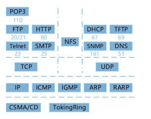 下图是各种协议所对应的位置,需要识记,尤其是IP是属于网络层,TCP/UDP是属于传输层。