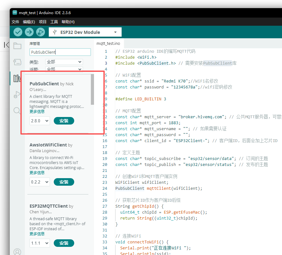 ESP32 + Arduino IDE 开发的 MQTT 通信程序