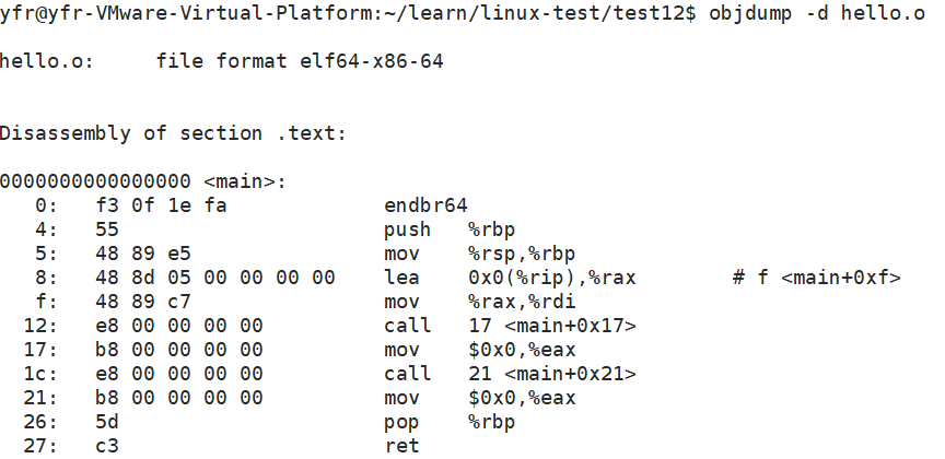 编译过程没有什么问题,说明我们在编译过程是没有函数的具体实现方法也可以编过的。此时我们来看一下这两个.o文件的反汇编内容: