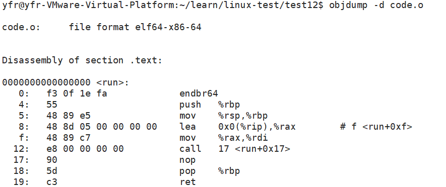 最后main函数成功调用了run函数,所以说明这两个.o文件(以及C标准库)的.text部分(代码区)合并了,并进行了统一的编址。链接过程中会修改.o中没有确定的函数地址,代码合并之后就可以通过call函数地址来进行函数调用。