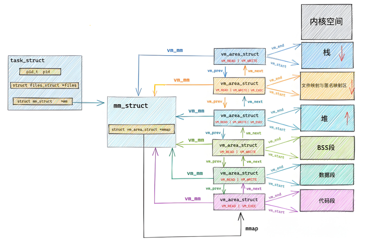 ELF文件中的每个LOAD类型Segment(需要加载的段)在程序加载时,都会在内核中创建一个对应vm_area_struct结构体,该结构体继承了Segment的虚拟地址范围、访问权限和文件偏移等关键信息,成为该段内存在内核中的运行时管理单元。所有这些由Segment初始化的vm_area_struct共同构成了mm_struct所管理的完整虚拟地址空间,而mm_struct又被包含在进程的顶级描述符task_struct中,从而完成了从静态文件到动态进程的内存组织,操作系统正是通过这些vm_area_struct对象来建立虚拟地址到物理内存的映射并管理整个进程地址空间。