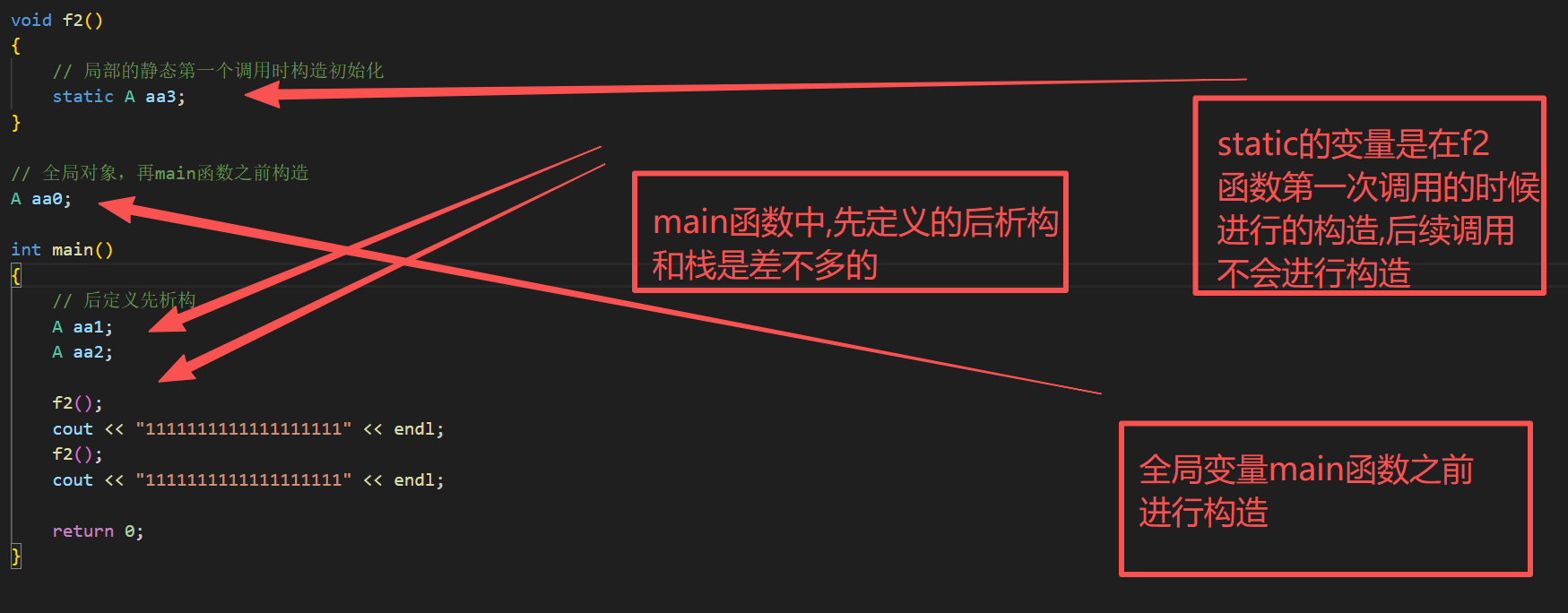 {// 后定义先析构A aa1;A aa2;f2();cout << "1111111111111111111" << endl;f2();cout << "1111111111111111111" << endl;return 0;