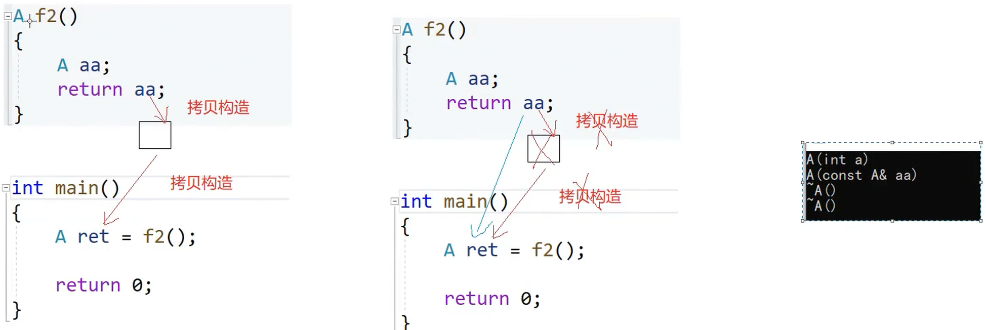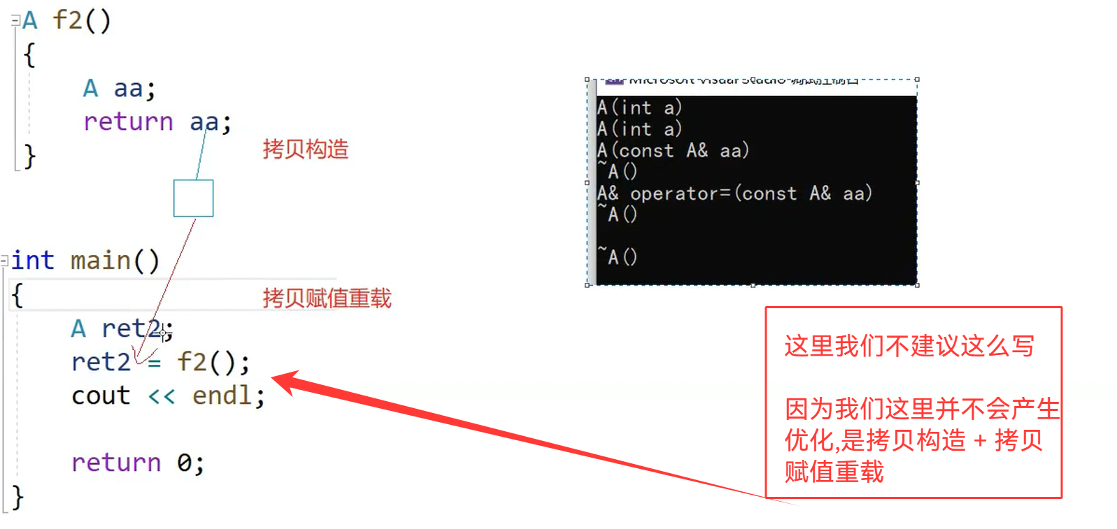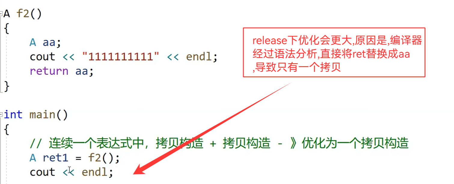 {// 连续一个表达式中,拷贝构造 + 拷贝构造 - 》优化为一个拷贝构造A ret1 = f2();cout << endl;// 无法优化,建议尽量不要这样写A ret2;ret2 = f2();cout << endl;return 0;