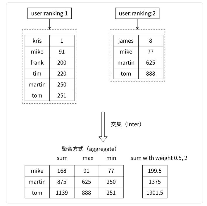 ZRANGE zset2 0 -1 WITHSCORES-- 示例1:基本并集运算(默认SUM聚合)