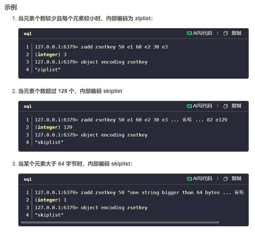 当有序集合的元素个数小于 zset-max-ziplist-entries 配置(默认 128 个),同时每个元素的值都小于 zset-max-ziplist-value 配置(默认 64 字节)时,Redis 会用 ziplist 来作为有序集合的内部实现,ziplist 可以有效减少内存的使用。