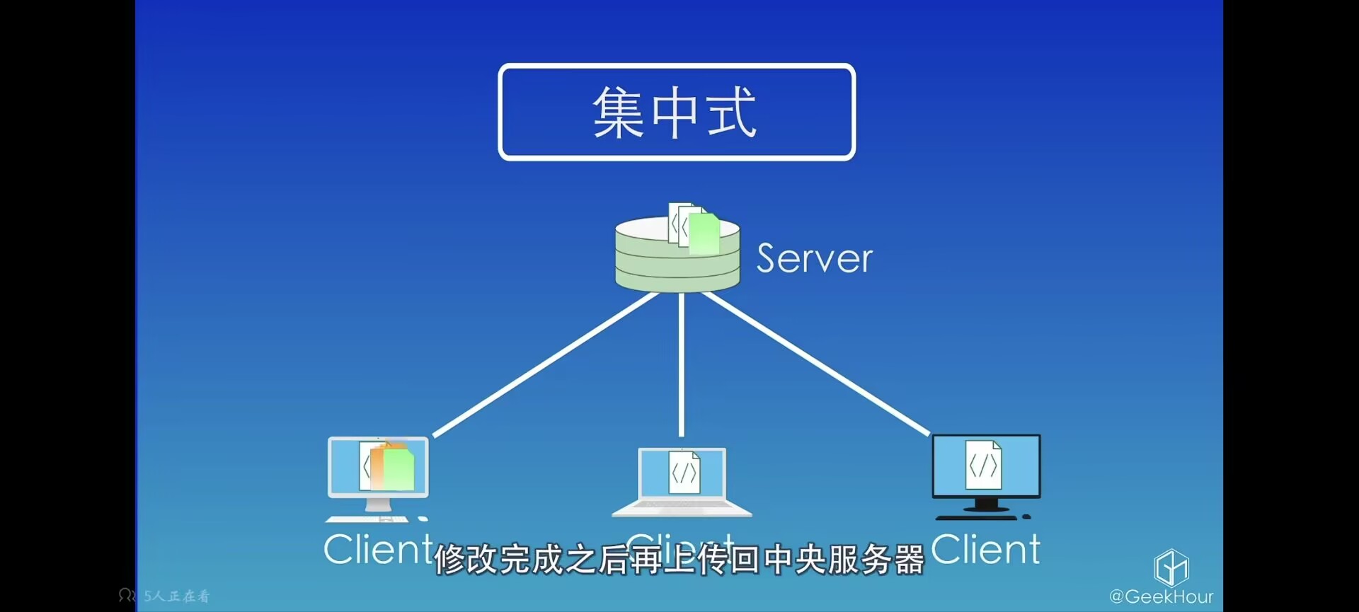 当需要修改文件时,需要先从中央服务器下载最新版本,修改完成之后,再传送给中央服务器