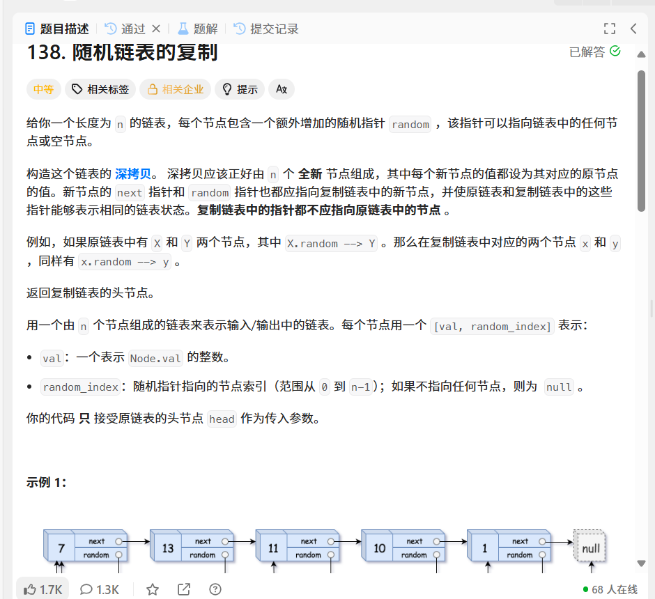 一次遍历,创建新结点,去赋值val和next值给到新结点,就会出现无法赋值random的情况,因为出现了问题1,二次遍历赋值random会发现,出现问题2,ramdom是指向原引用的。