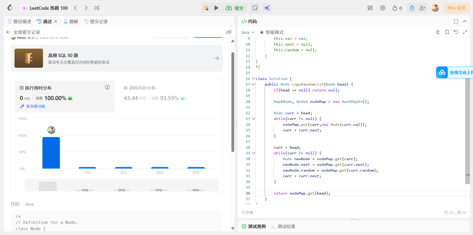 */class Solution {public Node copyRandomList(Node head) {if(head == null) return null;Map<Node, Node> nodeMap = new HashMap<>();Node curr = head;while(curr != null) {nodeMap.put(curr,new Node(curr.val));curr = curr.next;}curr = head;while(curr != null) {Node newNode = nodeMap.get(curr);newNode.next = nodeMap.get(curr.next);newNode.random = nodeMap.get(curr.random);curr = curr.next;}return nodeMap.get(head);}