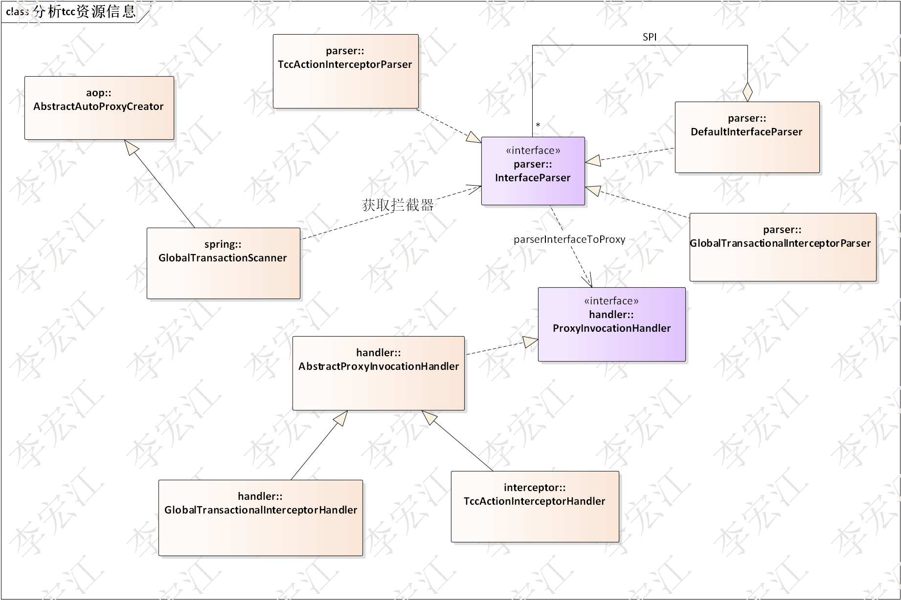 GlobalTransactionScanner前面介绍过,负责检测spring管理对象是否参与分布式事务,织入seata逻辑,检测工具是资源(对象)分析器,InterfaceParser