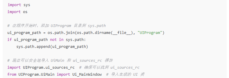 为了确保 Python 能正确找到 UIProgram 目录中的资源文件,可以在程序开始时手动添加该目录到 sys.path: