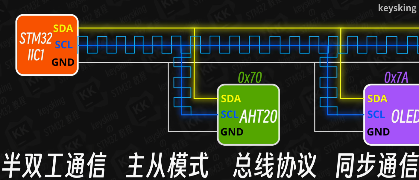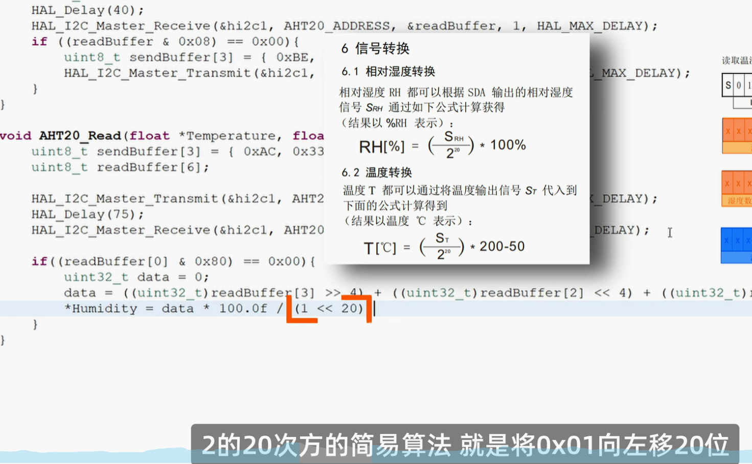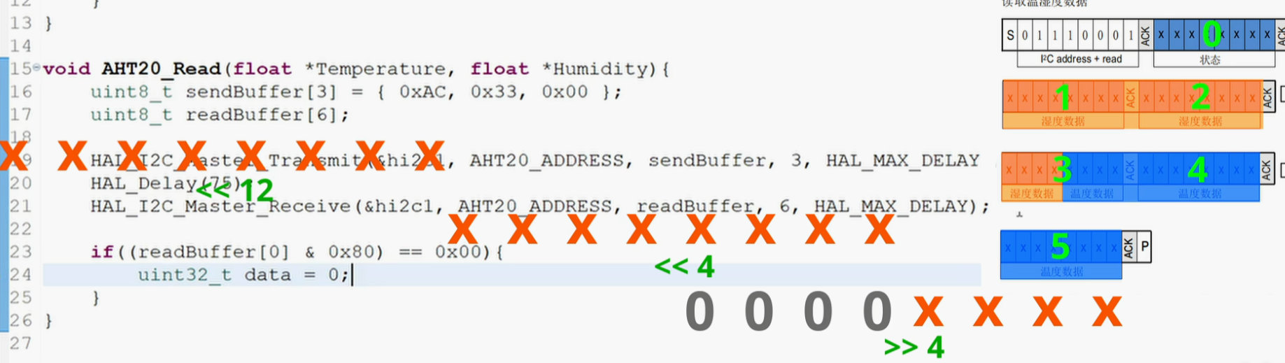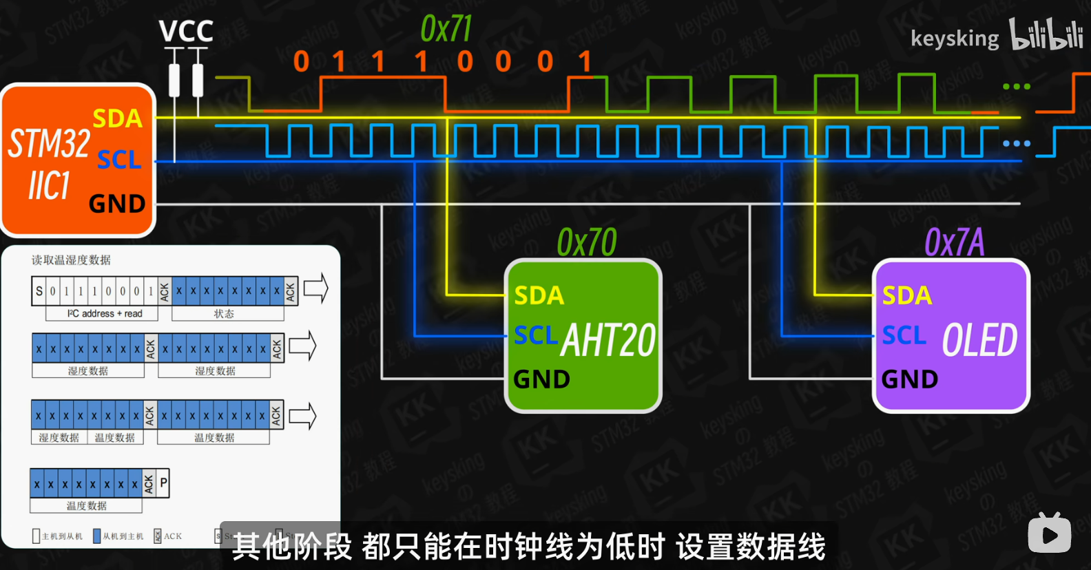 注意aht20的地址0x71的原因(本身芯片是7位地址0x38来着,不是八位,所以在右边加0补充成八位成为0x70,对于i2c的话,如果是要读取从机数据,那么加的这位就得是1,所以是0x71--------------hal库自动完成了,不需要我们手动发71,我们发70就行,自动会加1)
